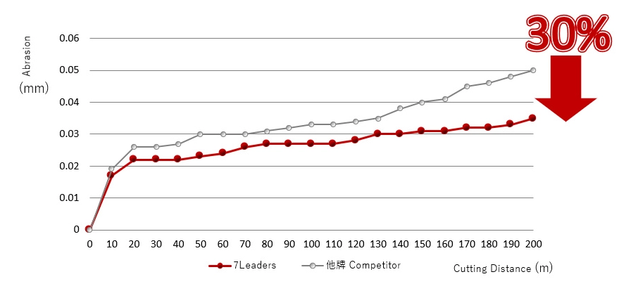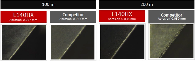 ด้วยเงื่อนไขการทดสอบที่เหมือนกัน E140HX จาก 7Leaders มีอัตราการสึกหรอน้อยกว่าคู่แข่งถึง 30% หากดูเปรียบเทียบจากรูปประกอบจะเห็นได้ว่าคมตัดของ E140HX สามารถทนต่อการสึกหรอได้ดีกว่า